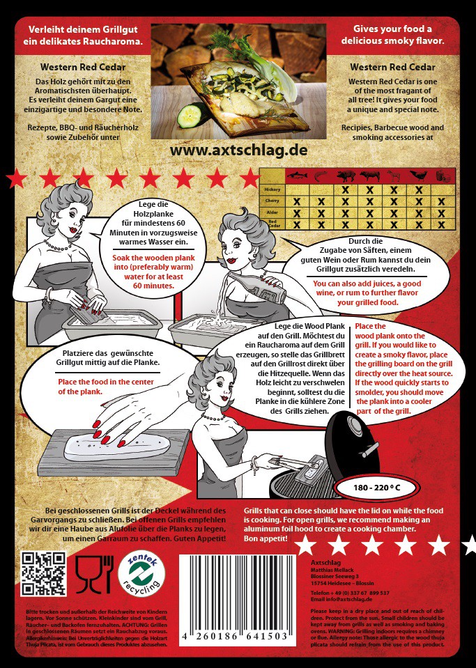 Die Räucherbretter von Axtschlag eignen sich zur Verwendung in sämtlichen Grillgeräten. Dazu werden sie zunächst für mindestens 60 Minuten in warmes Wasser eingelegt. Anschließend das Grillgut auflegen und das Brett über einer Hitzequelle platzieren (180-220°C). Sobald das Holz zu schwelen beginnt, in den indirekten Bereich ziehen.