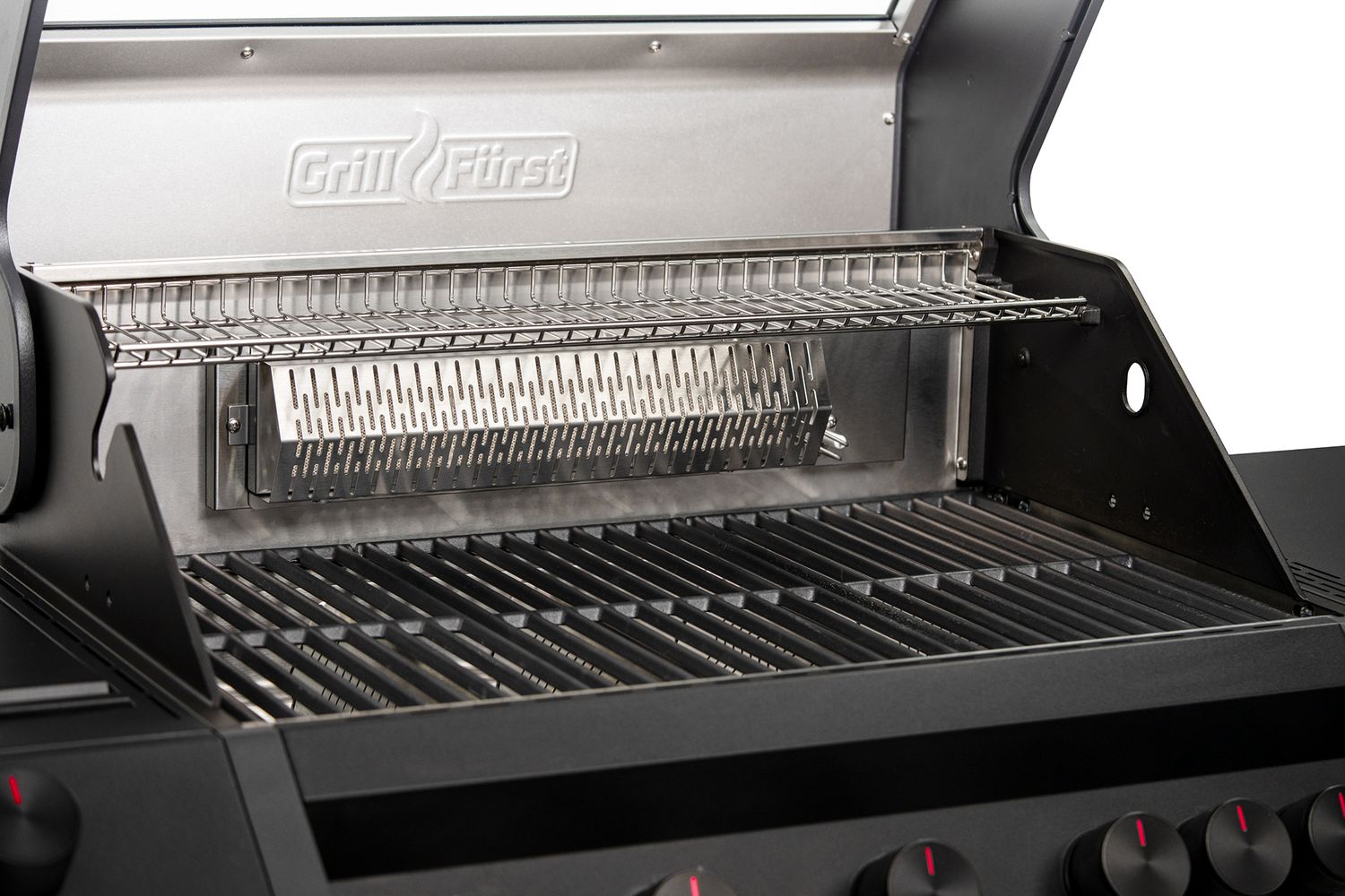 - Große Garkammer mit 5 Edelstahlbrennern und Infrarot-Backburner (Rotisserie optional erhältlich)